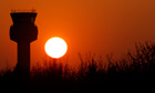 The sun sets behind the air traffic control tower at East Midlands Airport