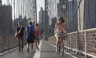 A cyclist crosses the Brooklyn Bridge in New York City. Bloomberg's infrastructure initiatives have led to a huge rise in people chosing cycles to commute to work. Photograph: Mario Tama/Getty Images Photograph: Mario Tama/Getty Images