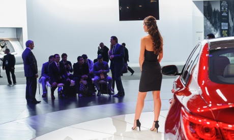 The venue – the new Cobo Conference Center atrium, lit by a four-storey glass window overlooking the Detroit River. Photograph: James Fassinger for the GuardianPhotograph: James FassingerJohn Mendel of Honda establishes a pattern for the day – men in suits standing in front of cars and pictures of cars – as he introduces the new 2015 Honda Fit. Photograph: Bill Pugliano/Getty ImagesPhotograph: Bill Pugliano/Getty ImagesOf course, the men in suits are not doing the actual unveiling. This is from the BMW stand … Photograph: James Fassinger for the GuardianPhotograph: James Fassinger… as is this. Photograph: James Fassinger for the GuardianPhotograph: James FassingerA Corvette, sans distractions. Photograph: James Fassinger for the GuardianPhotograph: James Fassinger/The GuardianBack to the men in suits. Here, executive chairman Bill Ford introduces Ford's new advertising slogan. Photograph: Carlos Osorio/APPhotograph: Carlos Osorio/APFord group vice president Raj Nair introduces the new F-150 pickup, which weighs 700lbs less than the current model. Photograph: Tannen Maury/EPAPhotograph: TANNEN MAURY/EPAAlan Mulally, Ford president and CEO, executive chairman Bill Ford and COO Mark Fields are dwarfed by the F-150. Photograph: Carlos Osorio/APPhotograph: Carlos Osorio/APThe view from backstage. Car, lady, men in suits. Photograph: James Fassinger for the GuardianPhotograph: James Fassinger/The GuardianThis is a concept car – the Kia GT4 Stinger. Hence, perhaps, the absence of a man in suit. Or a lady in a jumpsuit. Photograph: Geoff Robins/AFP/Getty ImagesPhotograph: GEOFF ROBINS/AFP/Getty ImagesA 'detailer' attends to a detail of the Volvo XC Coupe – another concept car. Photograph: Rebecca Cook/ReutersPhotograph: REBECCA COOK/REUTERSOne more concept car – the very orange Nissan Sports Sedan. Photograph: Bill Pugliano/Getty ImagesPhotograph: Bill Pugliano/Getty ImagesInteriors and add-ons are on display too … Photograph: James Fassinger for the GuardianPhotograph: James Fassinger/The Guardian…as are some slightly bigger computers. Photograph: James Fassinger for the GuardianPhotograph: James Fassinger/The GuardianMercedes attempt something a little different with their 'lady next to car' display. Photograph: James Fassinger for the GuardianPhotograph: James Fassinger/The GuardianBut finally, what it's really all about … some serious car. Photograph: James Fassinger for the GuardianPhotograph: James Fassinger/The Guardian