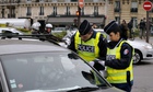 Police officers were out in force in Paris on Monday to ensure only cars with plates ending in odd numbers were on the streets. Photograph: Francois Guillot/AFP/Getty Photograph: Francois Guillot/AFP/Getty Images