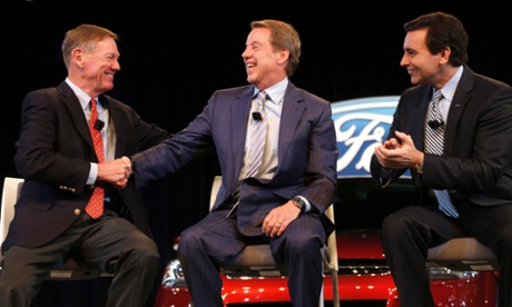 Ford CEO Alan Mulally (left) shakes hands with executive chairman Bill Ford after announcing Mark Fields (right) be the next CEO. Photograph: Rebecca Cook/Reuters Photograph: Rebecca Cook/Reuters