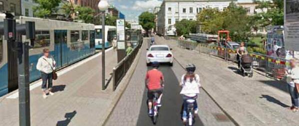 The main way to encourage cyclists on the roads is to reduce the threat from motor vehicles. The road should either be narrow enough that cars can’t pass cyclists, or wide enough that they can pass easily – the middle ground leads to collisions. Some cities are now experimenting with other options: Västra Hamngatan in central Gothenburg has recently introduced a street with smooth tarmac in the middle and cobbles on the sides. This encourages cyclists to take a central position in the road, preventing drivers from attempting dangerous passes, and also slows the cars down.